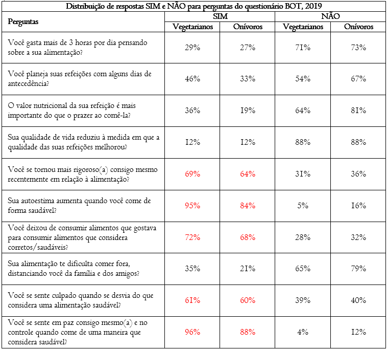 Como você pode ver, eu destaquei em vermelho as respostas SIM que totalizaram acima de 50%, tanto dos vegetarianos como dos onívoros. Para saber se as diferenças foram relevantes, a gente precisaria de um teste estatístico, mas quero demonstrar com isso que, neste questionário de 10 perguntas, a maioria dos vegetarianos e dos onívoros responderam SIM para 5 delas. De acordo com o instrumento, se 5 a 9 perguntas tiverem respostas SIM, a pessoa pode ser considerada "fanática por saúde" e se todas as perguntas forem SIM, então a pessoa apresenta ortorexia nervosa.